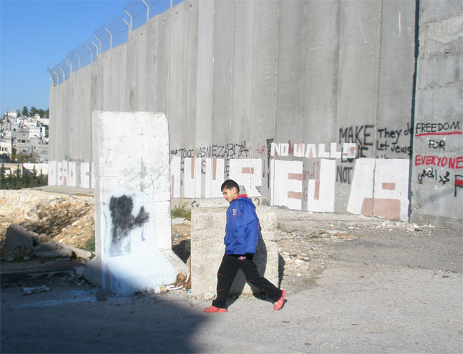 Six images were painted on walls, buildings and the eight-metre high Israeli security barrier that encircles the city, which Israel deems a protective measure against suicide attacks and Palestinians see as a symbol of oppression .
